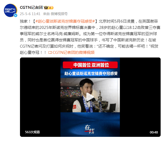 北京时间5月6日凌晨,在英国谢菲尔德结束的2025年斯诺克世界锦标赛决赛中,28岁的赵心童以18:12击败曾三夺赛事冠军的威尔士名将马克·威廉姆斯。成为第一位夺得斯诺克世锦赛冠军的亚洲球员,同时也是首位赢得世锦赛冠军的中国球手,书写了中国斯诺克新历史!在被CGTN记者问及打算如何庆祝时,他笑着说:“还不确定,可能去喝一杯吧!”祝贺赵心童夺冠!